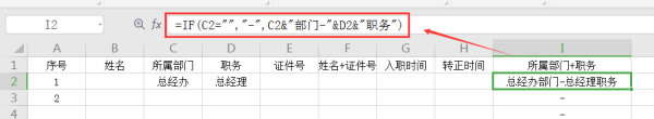 点击I2单元格,输入:=IF(C2="","-",C2&"部门-"&D2&"职务"),按enter键结束,然后下拉即可。