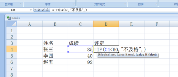 4、我们在if括号里输入“C4<60,”,这表面判断条件是张三成绩的对应单元格数值小于60,而逗号表示判断条件输入完毕。