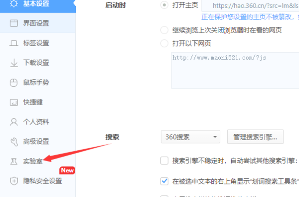 2、进入设置界面之后,在左侧导航栏选择【实验室】,然后在右边的界面中滚动鼠标滚轮,找到【360画报】选项,然后取消勾选【开启“360画报”功能】即可。