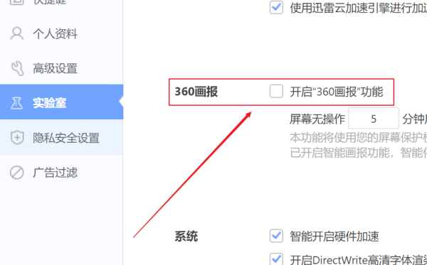 4、在出现的实验室设置界面中知道哦啊哦360画报,可以看到当前勾选开启了画报功能。取消360画报功能的勾选。