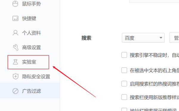 3、进入到该浏览器的选项界面,点击导航栏的实验室按钮进入。
