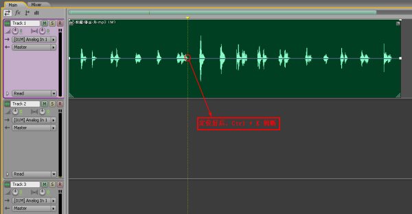 1.将时间指针定位在你要插入的“静音段”的起点,Ctrl+K执行剪断: