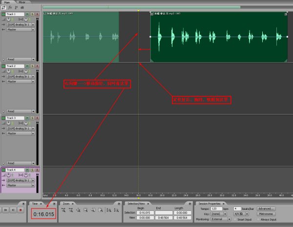 3.电脑键盘右向箭头(--->),同时看“时间”控制板上的时刻(横向放大窗口可走得更精准),到位后,右键将后面的音频块拉回到第二次定位的时间轴线,它会自动吸附到该点。