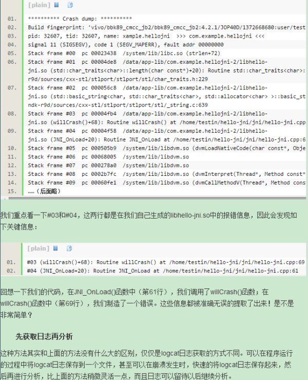 1,首先,来看看在hello-jni程序的代码中做了什么(有关如何创建或导入工程,此处略),下面代码中:在JNI_OnLoad()的函数中,即so加载时,调用willCrash()函数,而在willCrash()函数中,std::string的这种赋值方法会产生一个空指针错误。这样,在hello-jni程序加载时就会闪退。记一下这两个行数:在61行调用了willCrash()函数;在69行发生了崩溃2看看发生崩溃(闪退)时系统打印的logcat日志:、只要细心的查看,再配合Google提供的工具,完全可以快速地准确定位出错的代码位置,这个工作我们称之为“符号化”。需要注意的是,如果要对NDK错如何定位Android NDK开发中遇到的错误