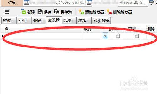 这样我们就打开了表的设计页面,可以看到有一个触发器选项卡,我们点击“触发器”