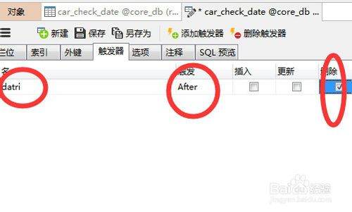 可以看到对应的选项,我们在名里面添加我们需要新建的触发器的名字,在触发选项中选择before或者after,然后在插入、更新、删除三个选项中勾选一个。