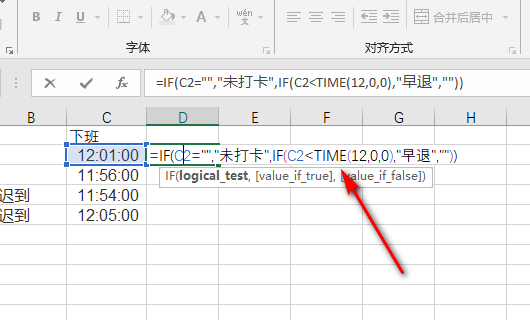 5、在下班时间中输入公式=IF(C2="","未打卡",IF(C2