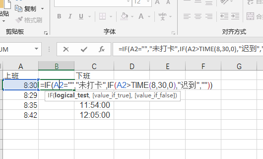 2、然后再上班中输入公式=IF(A2="","未打卡",IF(A2>TIME(8,30,0),"迟到","")),假设上班时间为8:30,。