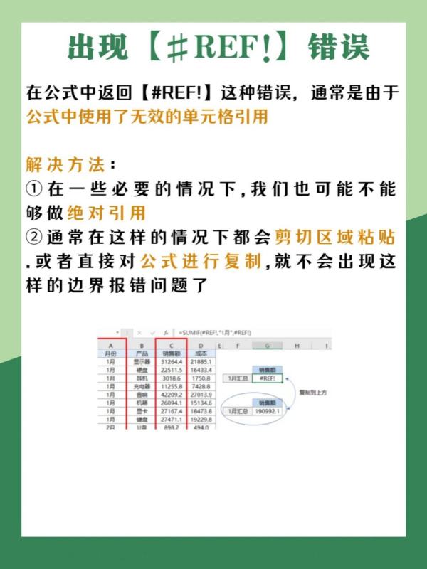 常见原因:如果公式返回的错误值为“#REF!”,这常常是因为公式中使用了无效的单元格引用。通常如下这些操作会导致公式引用无效的单元格:删除了被公式引用的单元格;把公式复制到含有引用自身的单元格中。