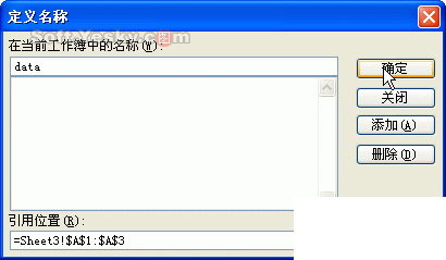 改正的方法为:选中“A1:A3”单元格区域,再选择菜单“名称→定义”命令,打开“定义名称”对话框,在文本框中输入名称“data”单击“确定”按钮(如图10)。