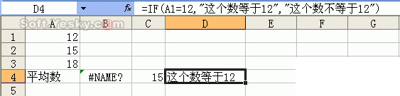 选中D4单元格,输入公式“=IF(A1=12,这个数等于12,这个数不等于12)”,回车后出现“#NAME?”错误(如12),原因是引用文本时没有添加引号。