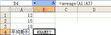 具体实例:如图8所示的工作表,我们想求出A1:A3区域的平均数,在B4单元格输入的公式为“=aveage(A1:A3)”,回车后出现了 “#NAME?”错误(如图8),这是因为函数“average”错误地拼写成了“aveage”,Excel无法识别,因此出错。把函数名称拼写正确即可修正错误。