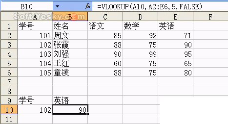如果要修正这个错误,则可以在A10单元格中输入一个A2:A6中存在的学号,如“102”,这时错误值就不见了(如图5)。