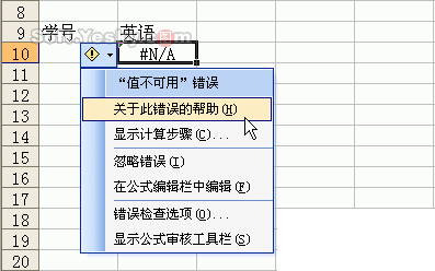 说明二:出现“#N/A”错误的原因还有其他一些,选中出现错误值的B10单元格后,会出现一个智能标记,单击这个标记,在弹出的菜单中选择“关于此错误的帮助”(如图6),就会得到这个错误的详细分析(如图7),通过这些原因和解决方法建议,我们就可以逐步去修正错误,这对其他的错误也适用。