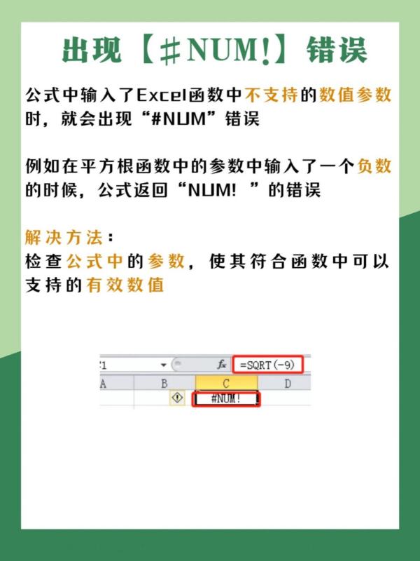 例如在平方根函数中的参数中输入了一个负数的时候,公式返回“NUM!”的错误