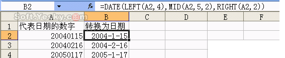 具体实例:如图19的工作表,我们利用公式将代表日期的数字转换为日期,在B2中输入了公式“=DATE(LEFT(A2,4),MID(A2,5,2),RIGHT(A2,2))”并复制到B4单元格。