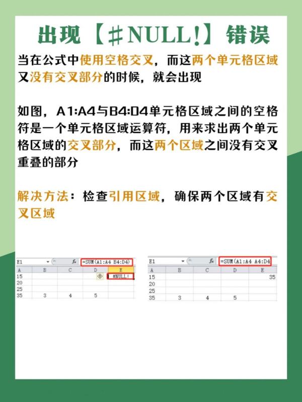 当在公式中使用空格交叉,而这两个单元格区域又没有交叉部分的时候,就会出现