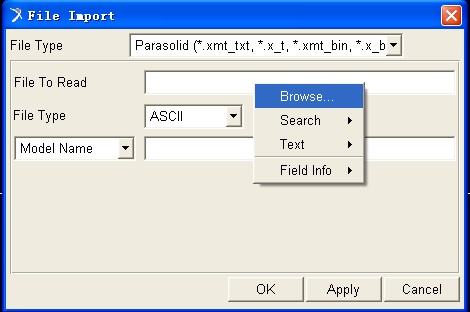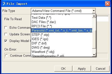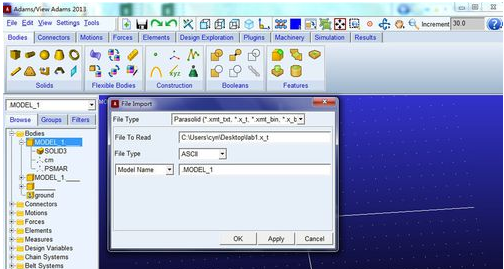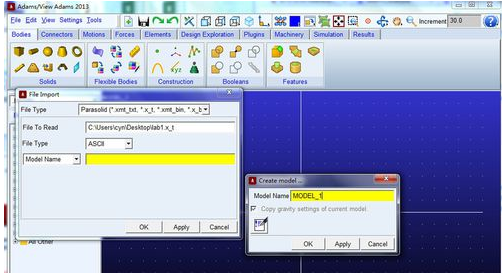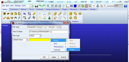 第三步:打开adams,进入界面后在菜单栏点击[file/import],然后选择File Type为Parasolid(*.xmt_txt,*.x_t.....),在File To Read中双击选择自己之前保存的目录(英文目录),File Type不用管,在Model Name右边栏目里右键,依次点击[Model/Create],然后依次点击OK