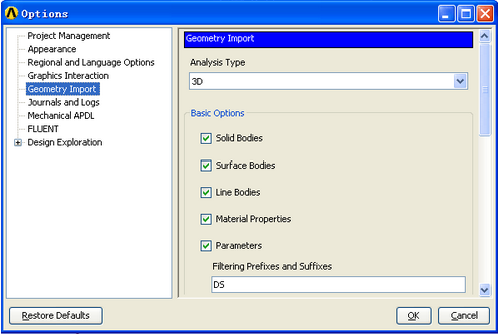 首先进入Workbench界面(不再赘述),选择Tools→Options,选中Geometry Import项,选中Parameters一栏,然后选择OK。