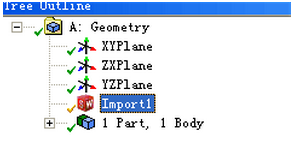 然后将Solidworks的模型导入到Workbench中,并进入DesignModel编辑模块,当导入模型后,选择Import1,在其属性栏中可以看到导入模型的参数(最后两栏),可以看到第一个参数前面没有方格,这就是因为没有加下划线的原因,第二个参数前就有方格,可以选中为参数。