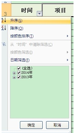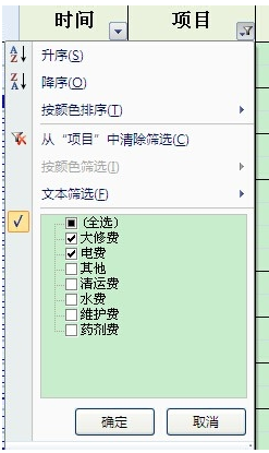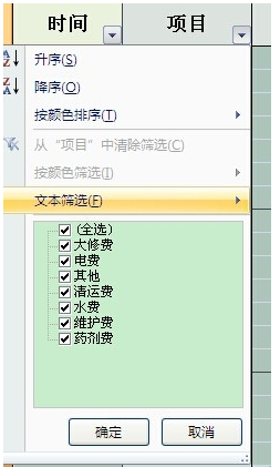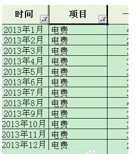 2.点击筛选后,数据项目栏右下角出现一个倒三角形,首先点开项目栏倒三角,只勾选“电费”,确定,再点开时间栏倒三角,只勾选“2013”,确定。这样2013年电费项就显示出来了