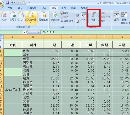 1.表格里有2013-2014两年的运行成本数据,现在需要筛选出来2013年电费和2013年电费与大修费合计。首先由时间那一栏开始全选整个Excel数据,找到工具栏中的“筛选”