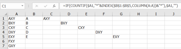 在C1中输入或复制粘贴下列公式=IF(COUNTIF($A1,"*"&INDEX($B$1:$B$5,COLUMN(A:A))&"*"),$A1,"")