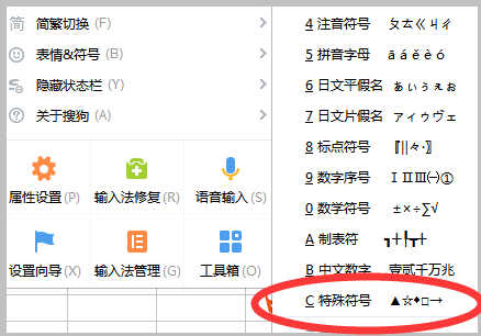 点击搜狗输入法中的软键盘,然后会出现“特殊符号”和“软键盘”两个选项。