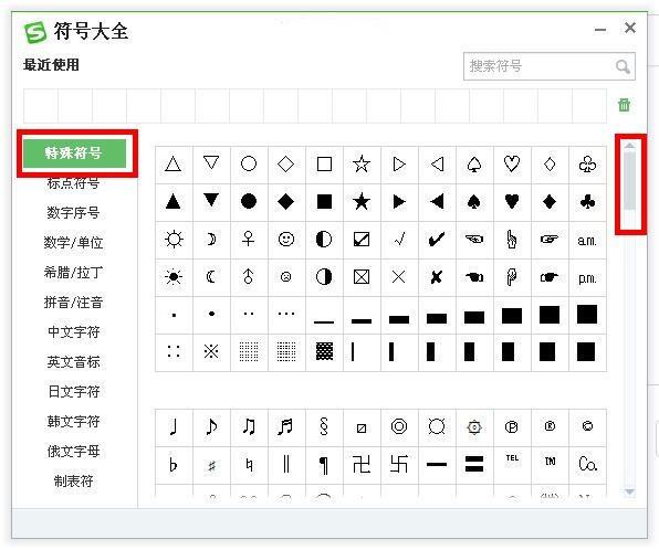第三步:显示“符号大全”对话框后,左侧列表首位的“特殊符号”可以找到不能用输入法直接打出的特殊符号。