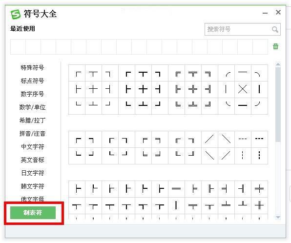 第四步:需要进行制图画线等符号的插入时,可以选择“制表符”,或根据个人需要,在左侧列表中找到对应的项目后选择即可。