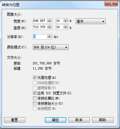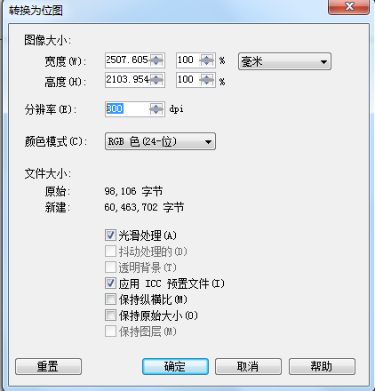 2、在弹出的"转换为位图"对话框中,将分辨率设置为2(尽量小,以保证导出的图片尺寸是原始尺寸),点击确定;在JPEG窗口中再次点击确定。