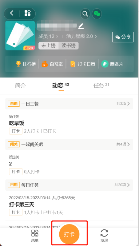 进入小打卡,首页上方是您已加入的圈子。点击进入需要打卡的圈子后,有两种方法进行打卡: