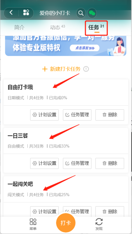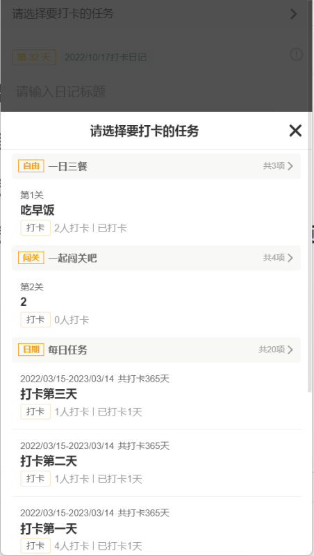 ②直接点击下方的橙色打卡键,选择需要的计划与任务进行打卡。