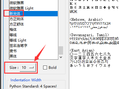 4、然后在打开的窗口页面中,默认字体是新宋体,大小是size=4。