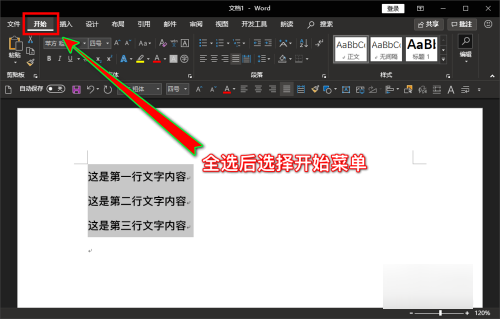 2、进入后,我们全选需要调整行间距的文字内容,全选后在软件顶部菜单栏选择“开始”菜单选项。