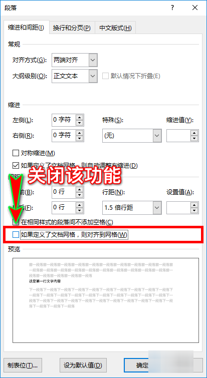 5、接着在弹窗底部找到“间距”设置栏,在设置栏下方继续找到并取消勾选“如果定义了文档网格,则对齐到网络”选项,也就是关闭该功能。