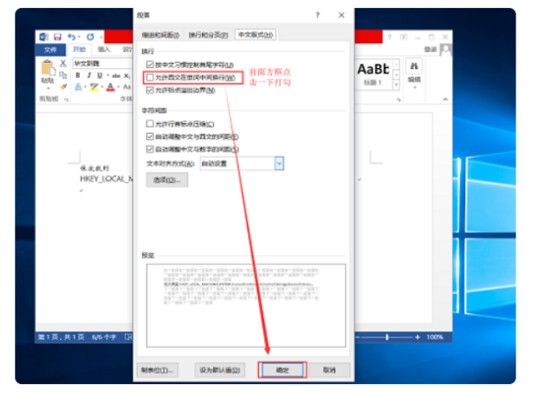 把【允许西文在单词中间换行】前面打钩,然后点击【确定】就好。