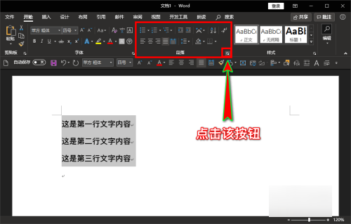3、在“开始”菜单下找到“段落”选项组,在该选项组右下角找到并点击一个扩展功能折叠按钮。