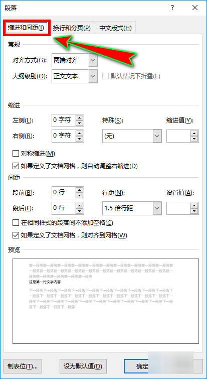 4、点击后就会打开“段落”设置弹窗,打开后我们在顶部的菜单选项卡里选择“缩进和间距”菜单项。