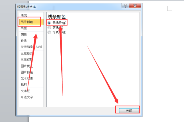 5、点击左侧“线条颜色”,选择“无线条”,然后点击下面的“关闭”按钮即可。