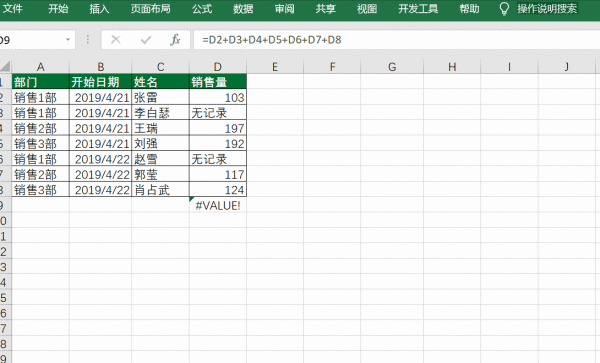 比如这里用加法求和时,加上了文本,这时就出现错误值。