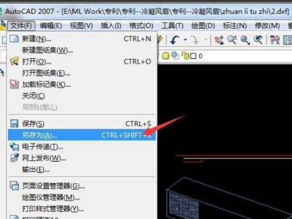 3、在弹出的对话框中,选择保存位置和文件名,同时注意文件类型选择下拉列表中的2004/LT2004 DXF模式