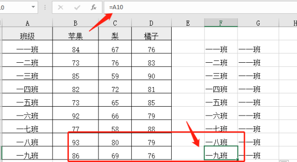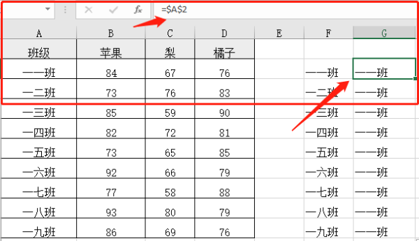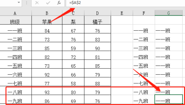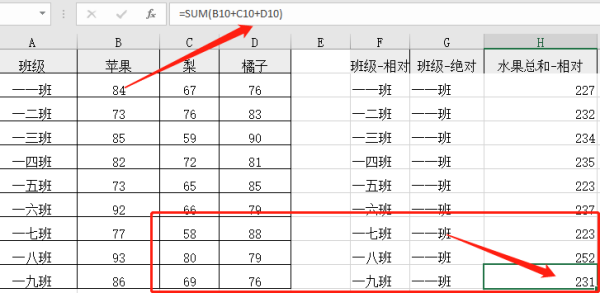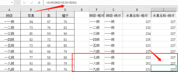 可以看到在各班级水果求和的函数中,H列的相同引用得到不同班级的结果,而I列的绝对引用得到相同的一一班的水果总和。