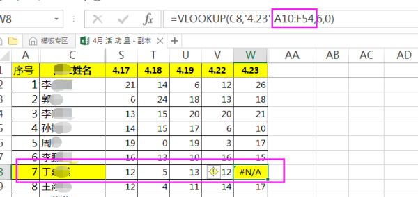 3、原因A表序号7“于”,在B表中选中的区域正好没有“于”,就会出现#N/A,也就是说在B表中,随着A表数据的下移,对应的B表中的选择区域也是下移的,A表C8对应B表中A10:F54,故#N/A。