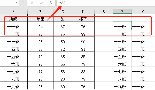 F2对应A2的数值,F列依次下拉得到最后一行的A9数据。