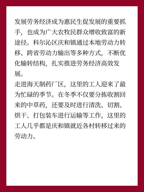 发展劳务经济成为惠民生促发展的重要抓手,也成为广大农牧民群众增收致富的新途径。科尔沁区庆和镇通过本地劳动力转移、跨省劳动力输出等多种方式,不断优化输转结构,扎实推进劳务经济高效发展。