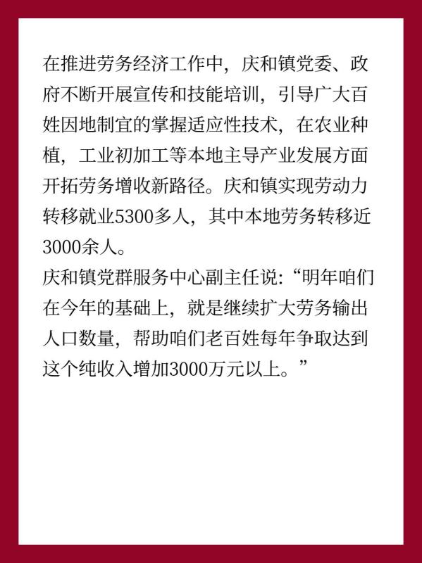 庆和镇党群服务中心副主任说:“明年咱们在今年的基础上,就是继续扩大劳务输出人口数量,帮助咱们老百姓每年争取达到这个纯收入增加3000万元以上。”
