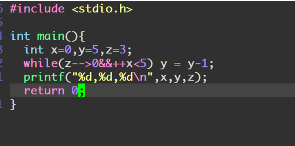 z=3开始进行判断是否大于0,如果是进行自减变为2,然后判断x+1后的值是否小于5,如果是的话,那么y进行自减1。