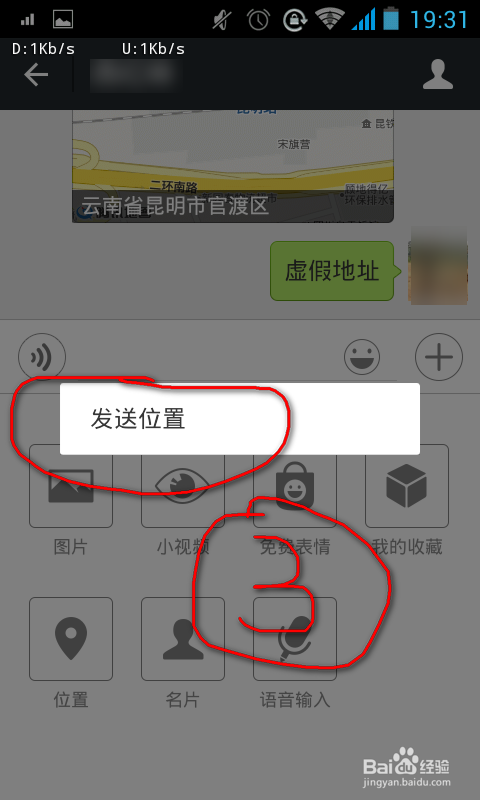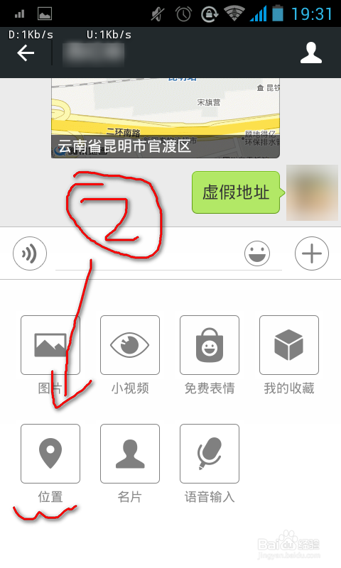 3.我给好友发虚假位置,那么在右下角的“+”号里头,有个位置。点击它,选择发送位置。如图所示: