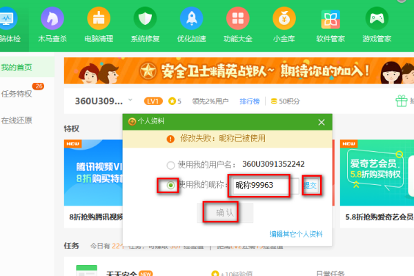 在360注册的登入用户名不可更改,但是可以更换显示用户名也就是昵称。
